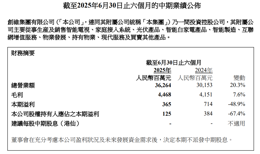 今年上半年,创维集团实现营收362.64亿元(人民币,下同),同比增长20.3%。股权持有人应占溢利(归母净利润)同比大降67.4%,仅为1.25亿元。董事会在充分考虑公司盈利状况及未来发展资金需求后,决定不派发中期股息。